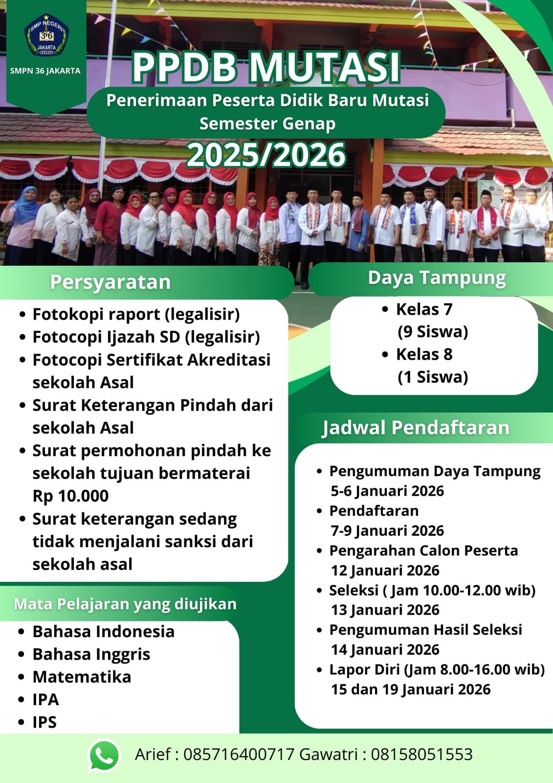 Informasi Penerimaan Mutasi Masuk Peserta Didik di SMPN 36 Jakarta Semester Genap Tahun Pelajaran 2025/2026